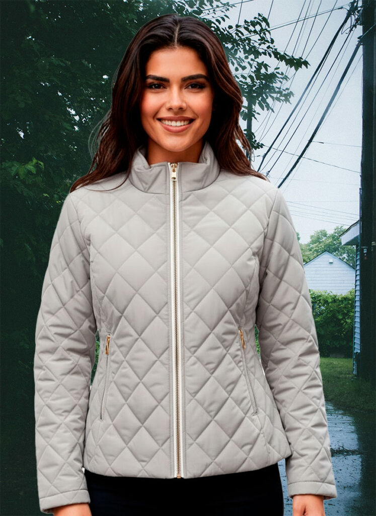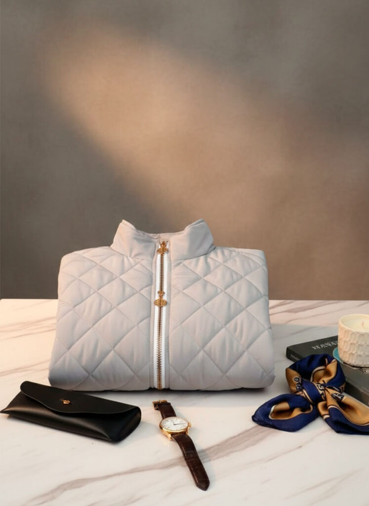 Diseñada para la mujer que valora la exclusividad, esta chaqueta destaca por su sofisticado tono gris perla y un elegante acolchado de rombos. El verdadero toque de distinción lo aporta su cremallera principal en un deslumbrante tono dorado, que eleva su diseño con un lujo sutil y refinado.