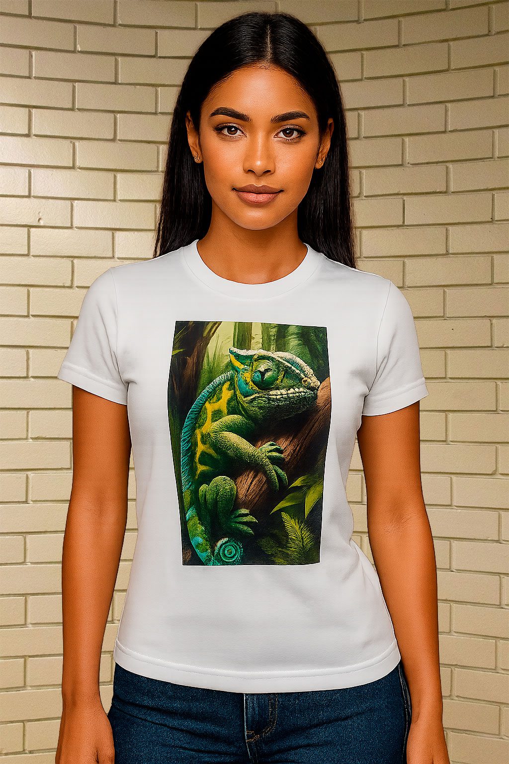 La camiseta estampada camaleón mujer de JG Studio es un lienzo para una impresionante ilustración hiperrealista, una forma de llevar el arte de la naturaleza a tu estilo.