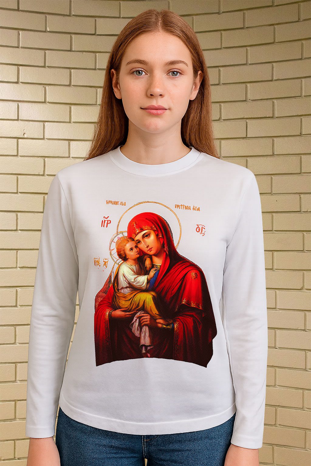 Los ricos colores dorados y rojos, junto con el estilo solemne y tierno de la imagen, transforman esta camiseta en una pieza de arte portátil. Es una elección perfecta para quienes aprecian la historia del arte cristiano o desean llevar un símbolo de fe que trasciende el tiempo. Su diseño de manga larga la hace ideal para climas más frescos o para un look más cubierto y elegante.