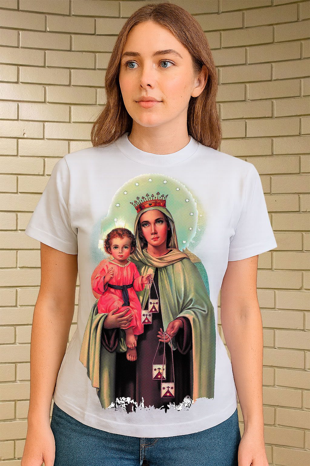 La imagen está impresa con colores vivos y detalles nítidos. Muestra a Nuestra Señora del Carmen sosteniendo al Niño Jesús y el santo escapulario. Es un recordatorio constante de su amparo y guía. Además, está confeccionada en algodón de alta calidad. Por eso, no es solo una pieza devocional. Es también una prenda cómoda y duradera para tu día a día.