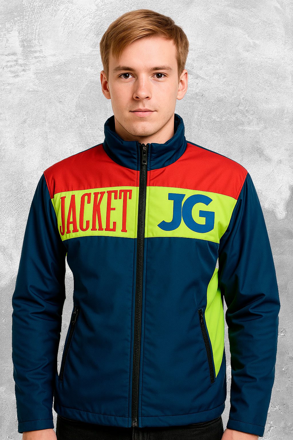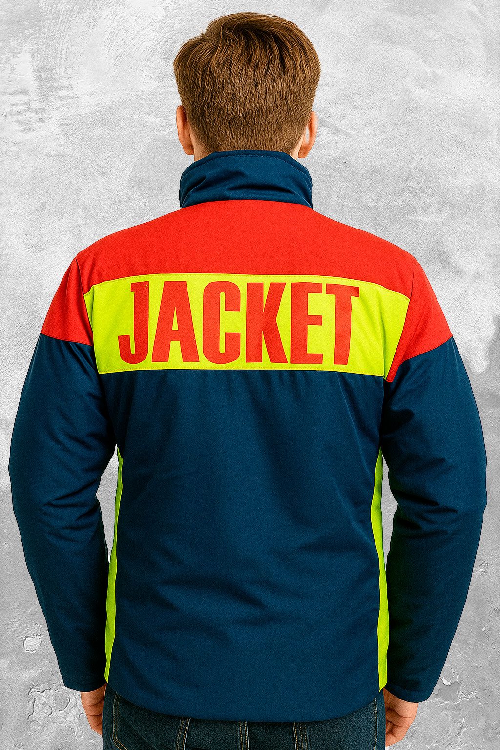 Diseño Gráfico de Alto Impacto: Con un audaz diseño color block en azul, rojo y amarillo neón, y tipografía llamativa, esta chaqueta está diseñada para no pasar desapercibida.